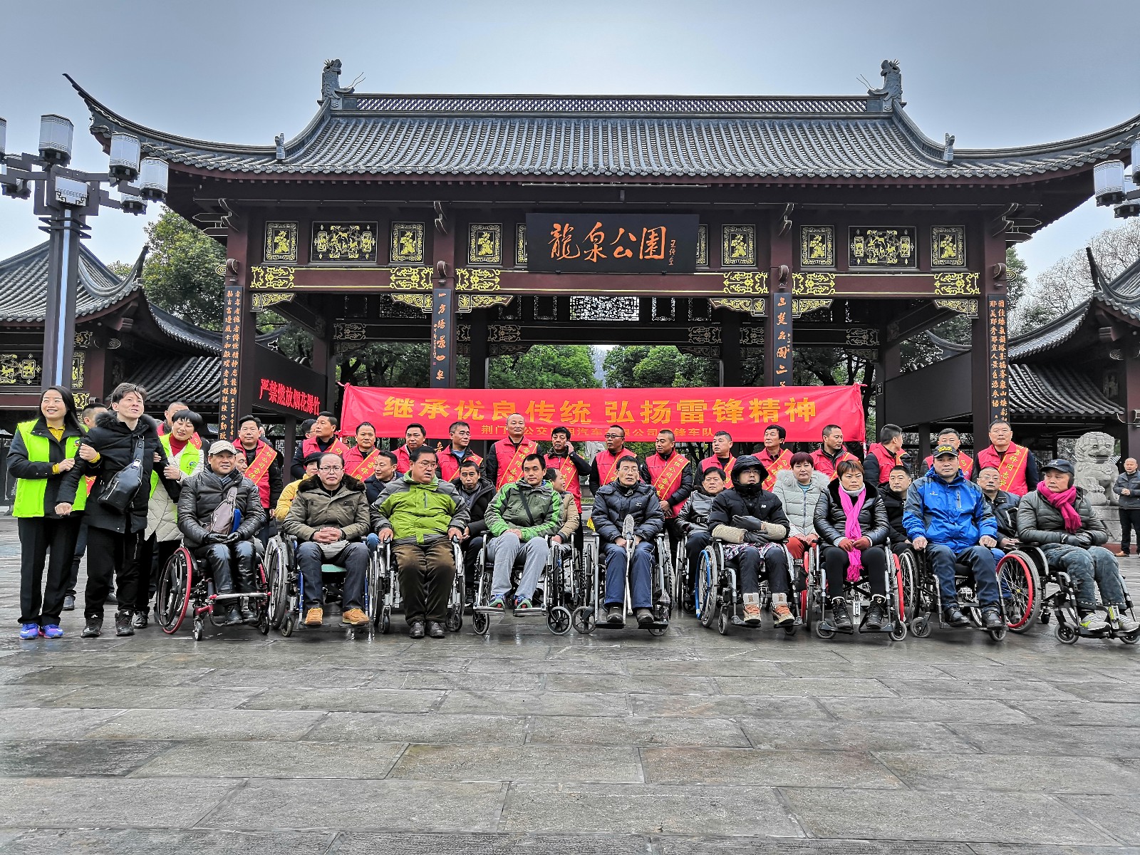 10時(shí),車隊(duì)到達(dá)龍泉公園,在新修建的公園門口殘疾朋友集中合影留念,在公交黨支部的帶領(lǐng)下共同宣讀入黨誓詞,唱雷鋒歌。在融洽歡樂的氛圍下開始了游園之行。