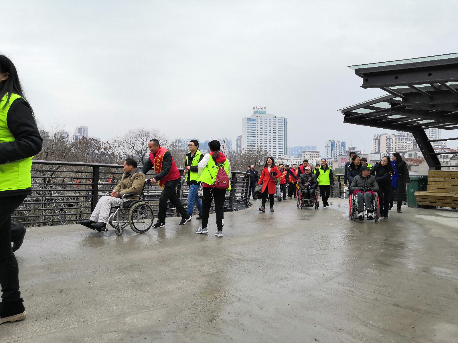 在公園新修建的盤山橋上,志愿者們推行著輪椅,與殘疾朋友以新的視角欣賞著山園美景,一路上歡歌笑語(yǔ)。在涼亭里大家輪流著唱歌助興,敞開心扉,訴說(shuō)著心中的故事。